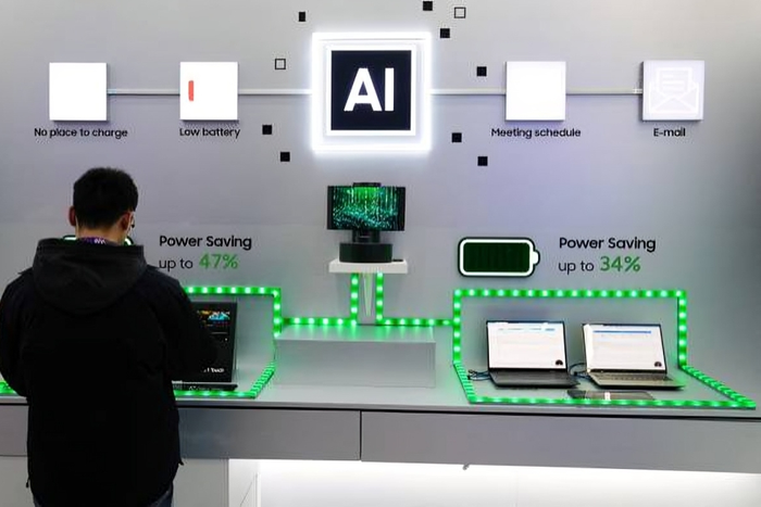 A man stands next to an AI (artificial intelligence) logo at the Mobile World Congress (MWC), the telecom industry's biggest annual gathering, in Barcelona on February 27, 2024.