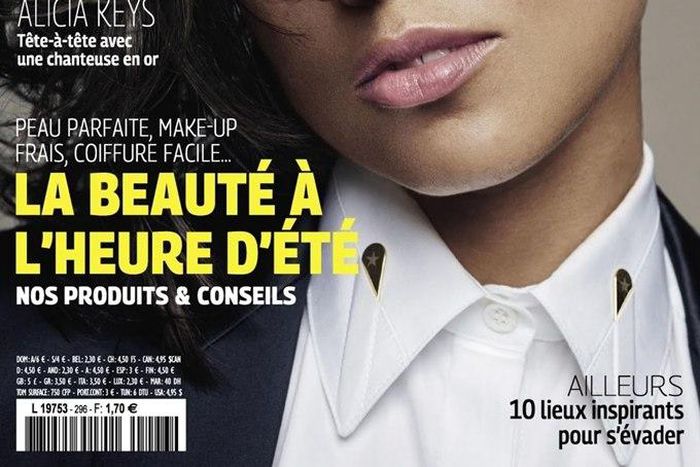 Alicia Keys who chose a white shirt and jacket for the conservative cover wore flawless makeup look with pink lips.
