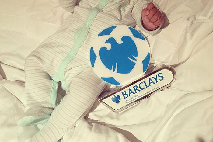 Manchester United striker celebrates his 'man of the match' award with his baby