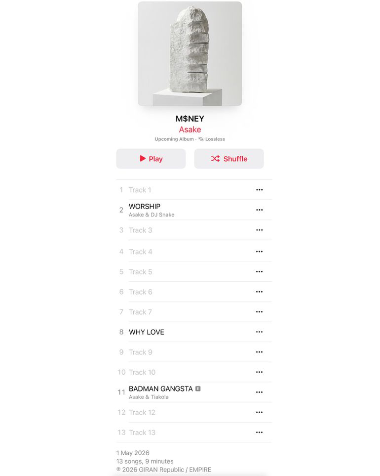 Asake's new album, titled 'M$NEY', will carry 13 tracks, including the already released singles 'Why Love', 'Badman Gangster' featuring French star Tiakola, and his most recent release 'Worship', featuring global musician and producer DJ Snake.