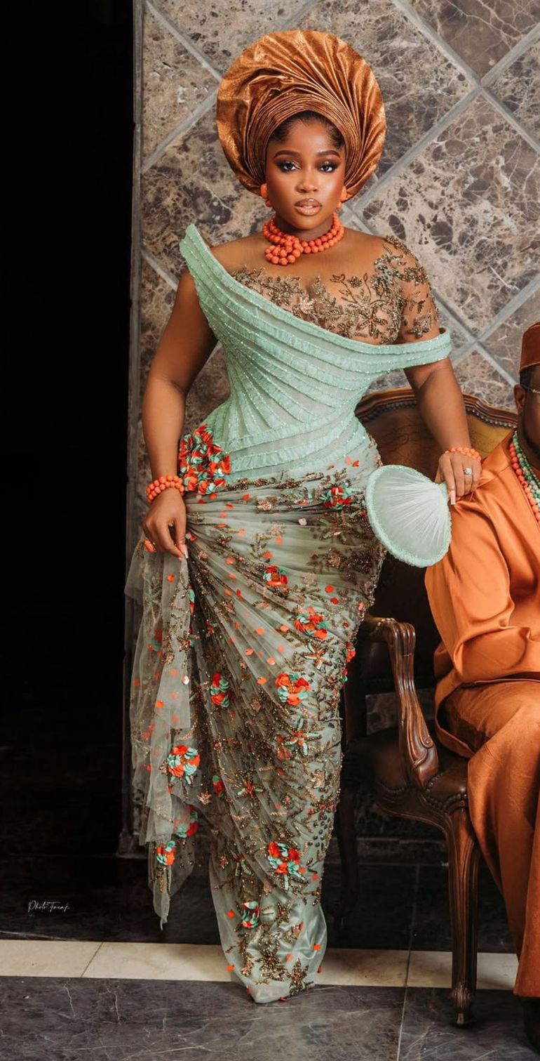 Soft, chic, and endlessly stylish, mint green with nude or brown is the perfect choice for a modern, minimalist vibe. This colour combo flatters every skin tone, and it is especially gorgeous for bridesmaids or close family members at weddings. Think flowy lace fabrics, nude gele, and a subtle pop of mint accessories.