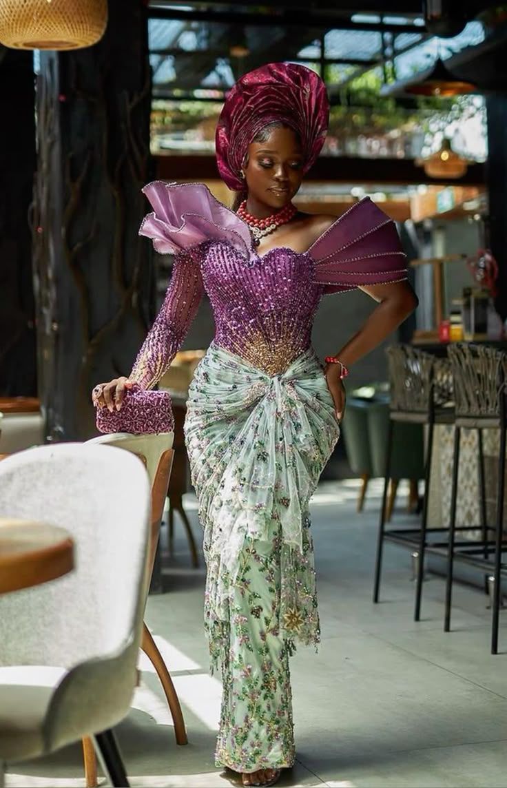 Talk about royalty! Purple and lilac scream luxury, and when matched with turquoise blue, the result is a glamorous and energetic mix. This pairing shines in beadwork and embellished lace, making it a hit for high-profile celebrations. If you want your asoebi to turn heads, this duo will do the job.