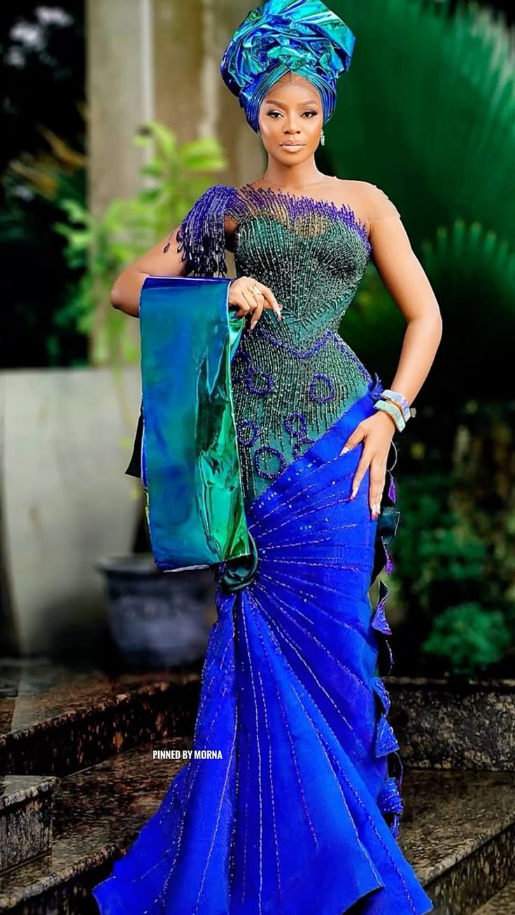 If you want a mix of calmness and majesty, this is your go-to combo. Shades of green like emerald, olive, or forest, paired with royal blue give off a rich, luxurious vibe. This look is perfect for large owambes, and this colour blend looks fantastic in lace and sequins.