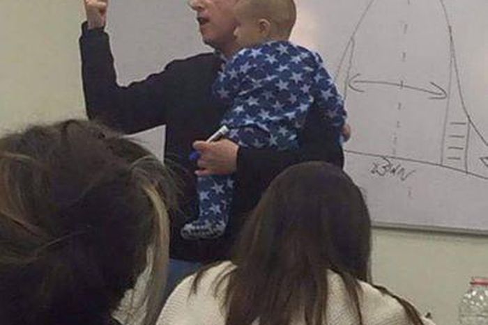 The professor who teaches at Hebrew University carried a baby who was crying in his class, and soothed the baby while teaching in class.