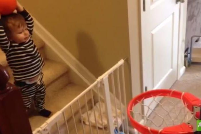 Below is a one year old baby whose hubby is making basketball trick shots. The future NBA baller is prolific as he sinks in the ball to the net with relative ease.