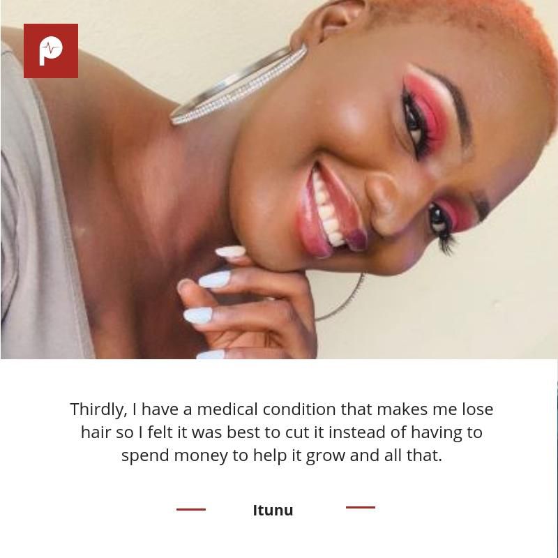While speaking with Pulse, as explained above, Itunu tells Pulse she has a health condition which makes her lose hair. This was one of the reasons she decided to cut it all off. After giving her first two pertinent reasons, Itunu says, “Thirdly, I have a medical condition that makes me lose hair so I felt it was best to cut it instead of having to spend money to help it grow and all that.”