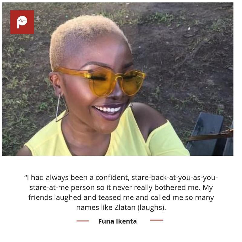 Funa Ikenta, a digital marketing specialist & pastry chef who now carries a buzz cut with a killer fade, tinted gold says, “I had always been a confident, stare-back-at-you-as-you-stare-at-me person so it never really bothered me. My friends laughed and teased me and called me so many names like Zlatan the rapper.