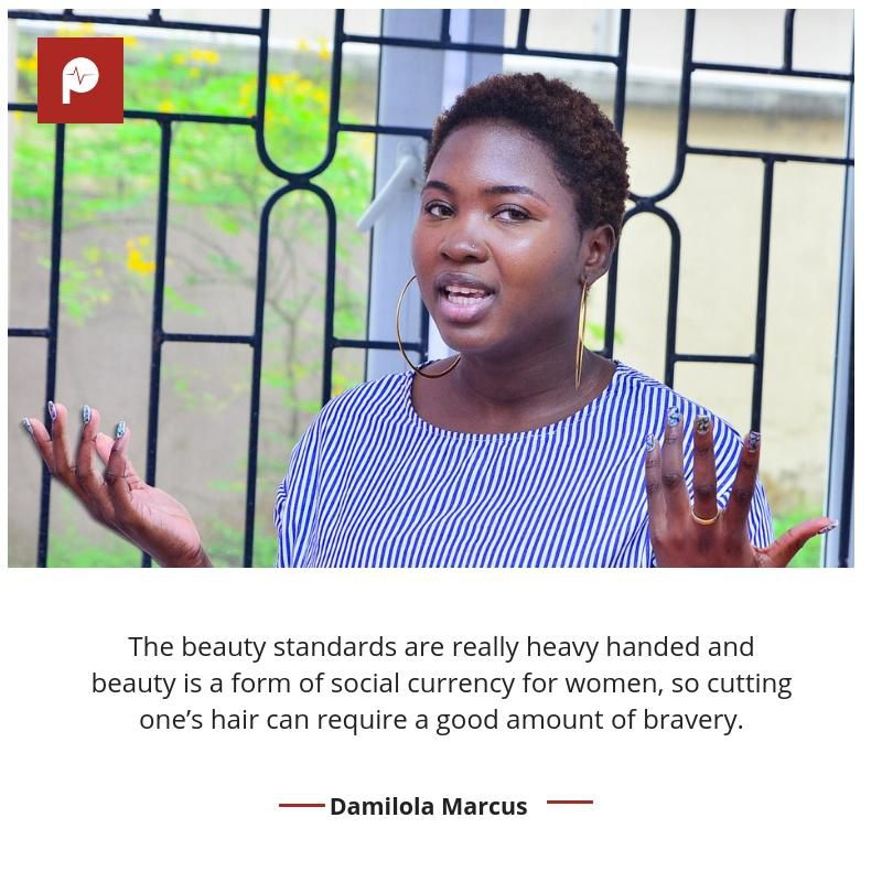 “The beauty standards are really heavy handed and beauty is a form of social currency for women, so cutting one’s hair can require a good amount of bravery” says Damilola Marcus.