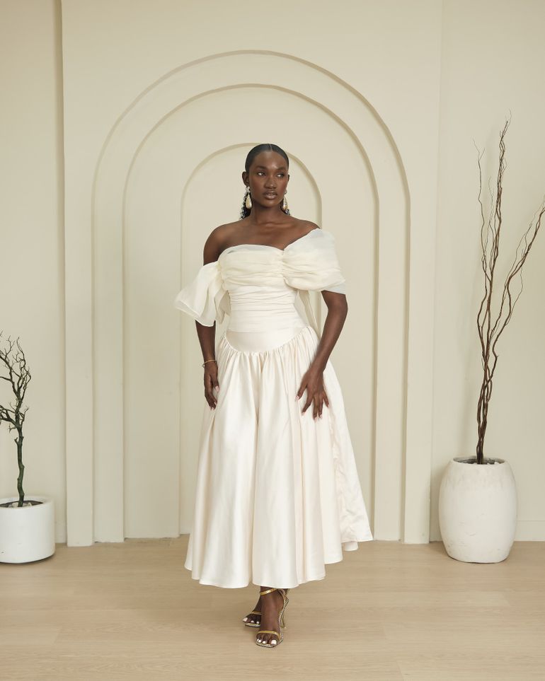 Debra Double Off Shoulder Dress by Moelle. Price: ₦205,000 - ₦220,000. Where To Buy: Shop Moelle Essentials.