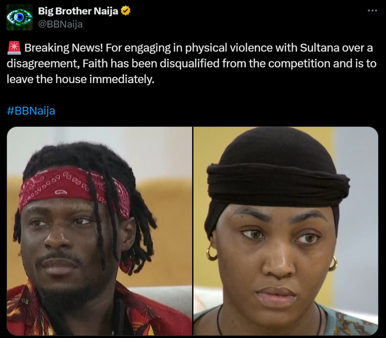 The official BBNaija X account shared that Faith has been disqualified for physical violence on Sultana, and he's to leave the house immediately.