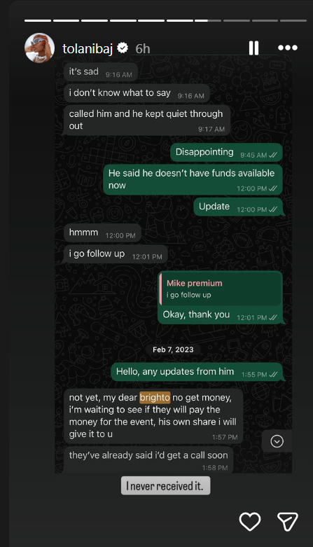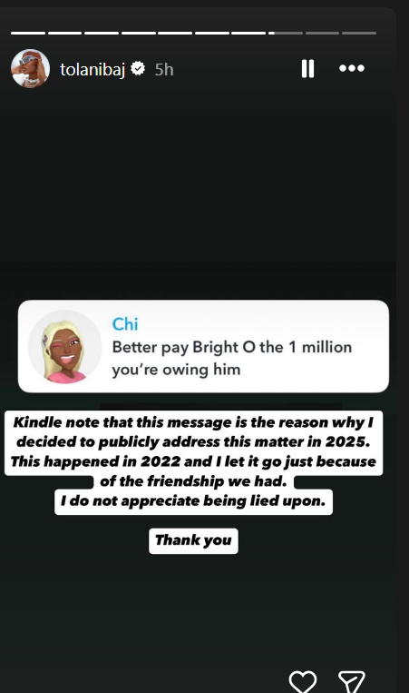 It all began on Snapchat when a follower told the reality TV star, “Better pay Bright the ₦.1 million you owe him,” a statement that immediately triggered Tolanibaj’s urge to set the record straight.