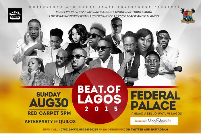 Beat of Lagos 2015 will see a commanding performance from its official talent sponsors, Chocolate City Records, a label that boasts acts like: MI Abaga, Ice Prince, Jesse Jagz, Ruby Gyang, Victoria Kimani, DJ Caise, and a host of others.