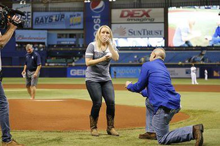 In recognition of her work as a dating and domestic violence advocate since her recovery, Melissa Dohme was invited to throw out the first pitch at Monday night's Tampa Bay Rays baseball game against the New York Yankees. The moment became even more exciting than she had expected when the baseball she was handed read "Will you marry me?"