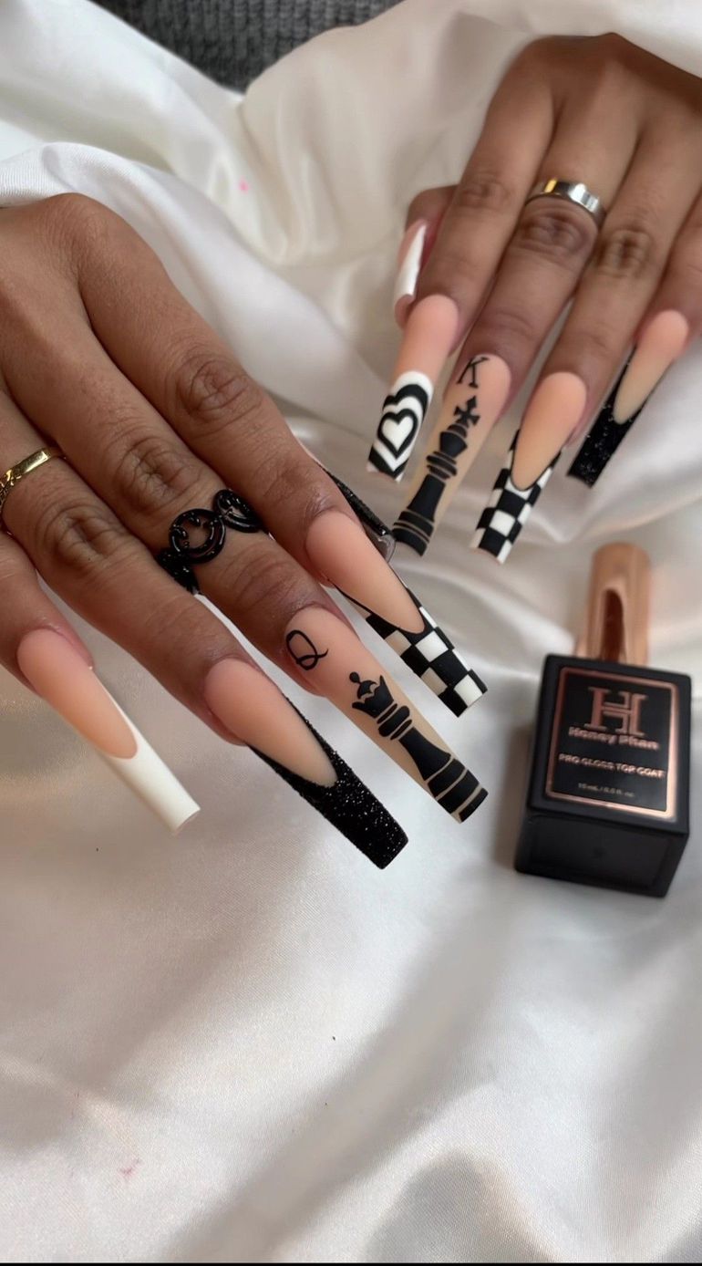 If you want to commit to the aesthetic, do it on your fingertips. A mix of black, white, and nude with delicate chess patterns ( pawns, rooks, or tiny boards) can be low-key or loud, depending on your preference.