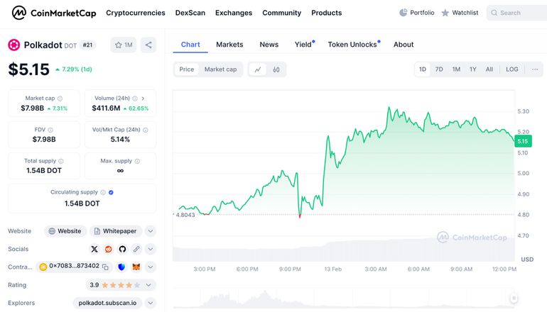 Chart of Polkadot’s price movement over the past 24 hours shows DOT trading at $5.15 based on CoinMarketCap data