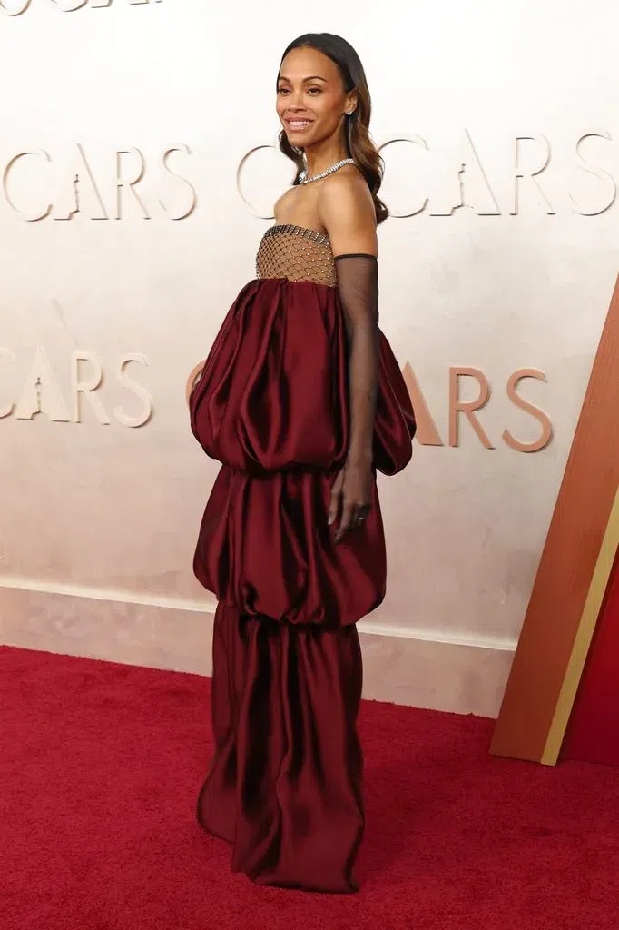 Zoe Saldana who won best actress in a supporting role looked sensational in a tiered dress in oxblood. Her gorgeous gown is custom Saint Laurent.