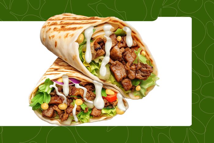 Originally a Middle Eastern dish, shawarma is traditionally made by stacking thin slices of lamb or chicken on a vertical spit and slowly roasting it. The juicy meat is then shaved off and wrapped in flatbread with vegetables, sauces, and sometimes chips or sausage.