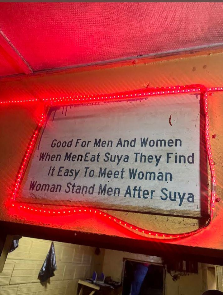 This spot is impossible to miss thanks to its iconic signage: “Good For Men And Women. When Men Eat Suya They Find It Easy To Meet Woman. Woman Stand Men After Suya.”