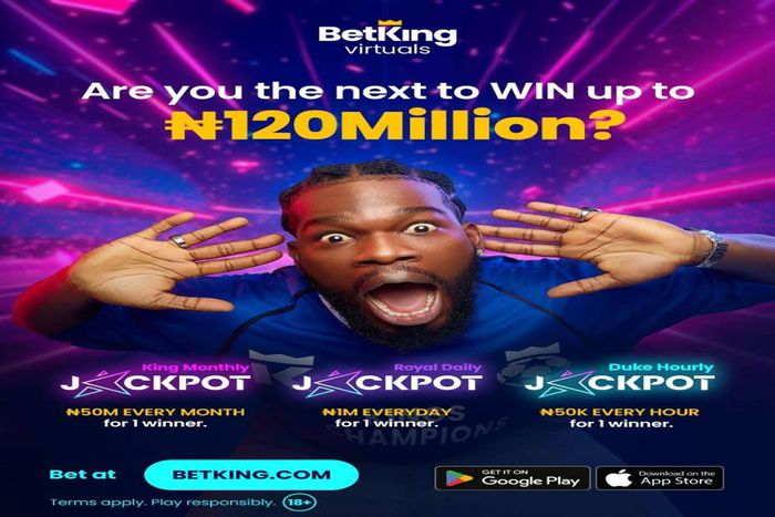 BetKing isn’t just raising the stakes; they’re rewriting the playbook. Will you be the next Virtuals jackpot millionaire? Your 50 million naira moment could be one GAME away. Play now on https://m.betking.com/virtual