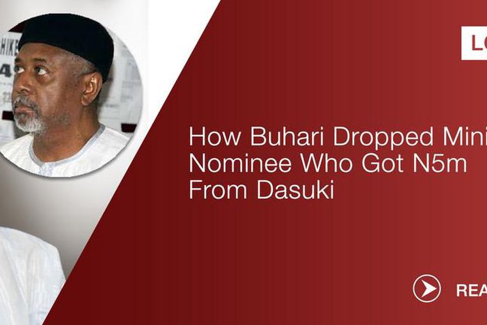 According to reports, President Muhammadu Buhari was forced to drop his political associate, Lawal Jafaru Isa as a ministerial nominee after discovering that the latter had accepted $5 million from former National Security Adviser (NSA), Sambo Dasuki.