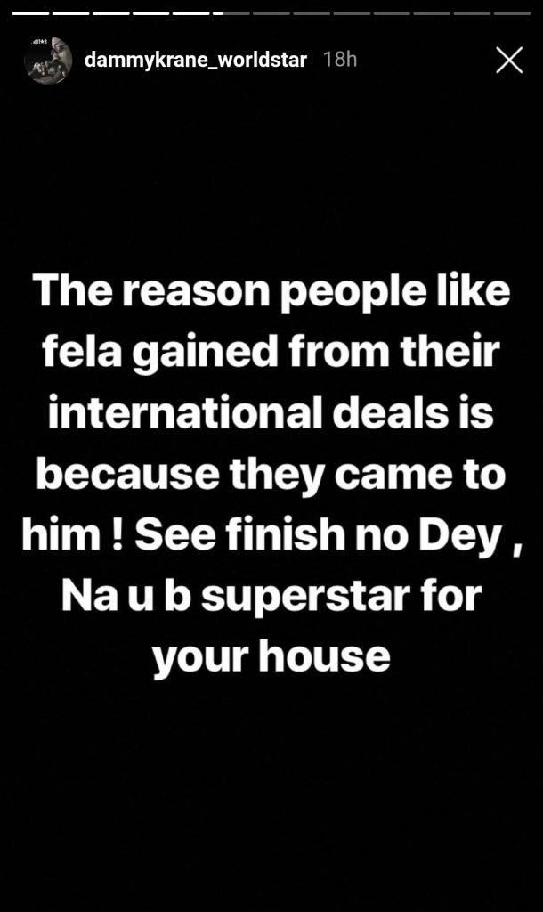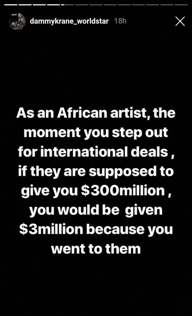 Earlier today, another Nigerian artist and Hypertek Digital signee, Dammy Krane has also lent his two cents to the matter. He took to his Instagram stories to write the following, “As an African artist, the moment you step out for international deals, if you were supposed to give you $300million, you would be given $3 million because you went to them.