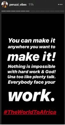 DMW artiste; Peruzzi took to his Instagram stories to respond. He says, “You can make it anywhere you want to make it! Nothing is impossible with hard work and God! Una too like plenty talk everybody face your work.”