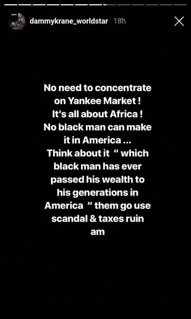 “No need to concentrate on yankee market! It’s all about Africa! No black man can make it in America… Think about it; Which black man has ever passed his wealth to his generations in America? Them go use scandal and tax to ruin am. The world to Africa.”