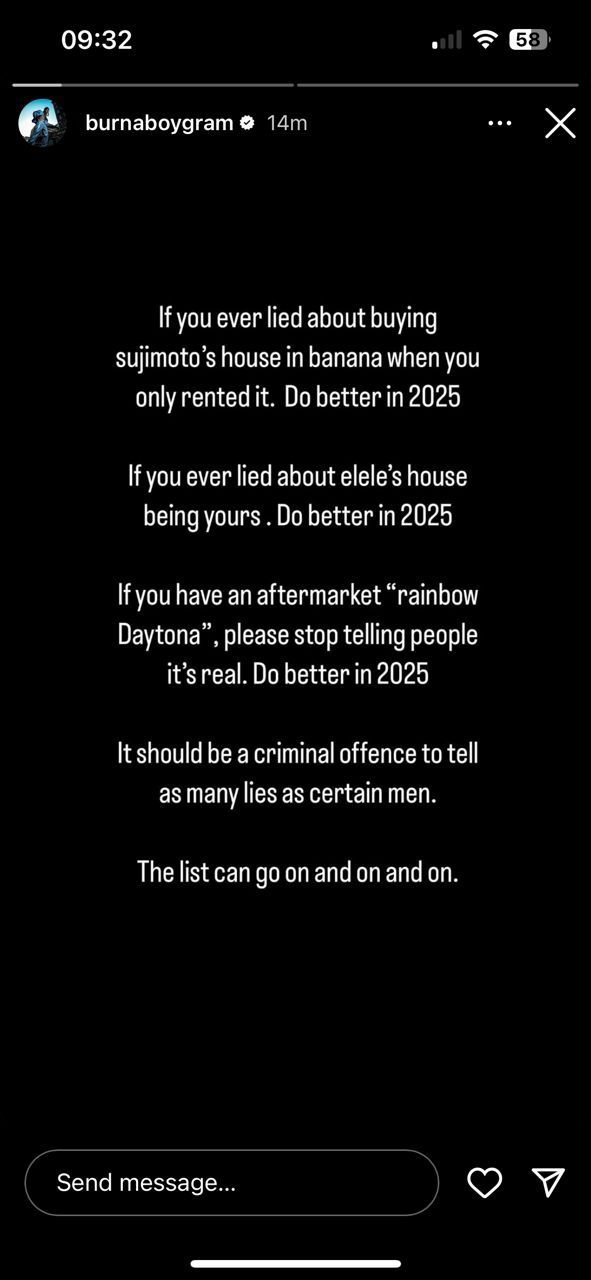 Taking to Instagram on December 30, 2024, he wrote, "If you ever lied about buying sujimoto’s house in Banana when you only rented it. Do better in 2025 If you ever lied about elele’s house being yours. Do better in 2025 If you have an aftermarket “rainbow Daytona”, please stop telling people it’s real. Do better in 2025 It should be a criminal offence to tell as many lies as certain men. The list can go on and on and on. (sent with new years effect.)"