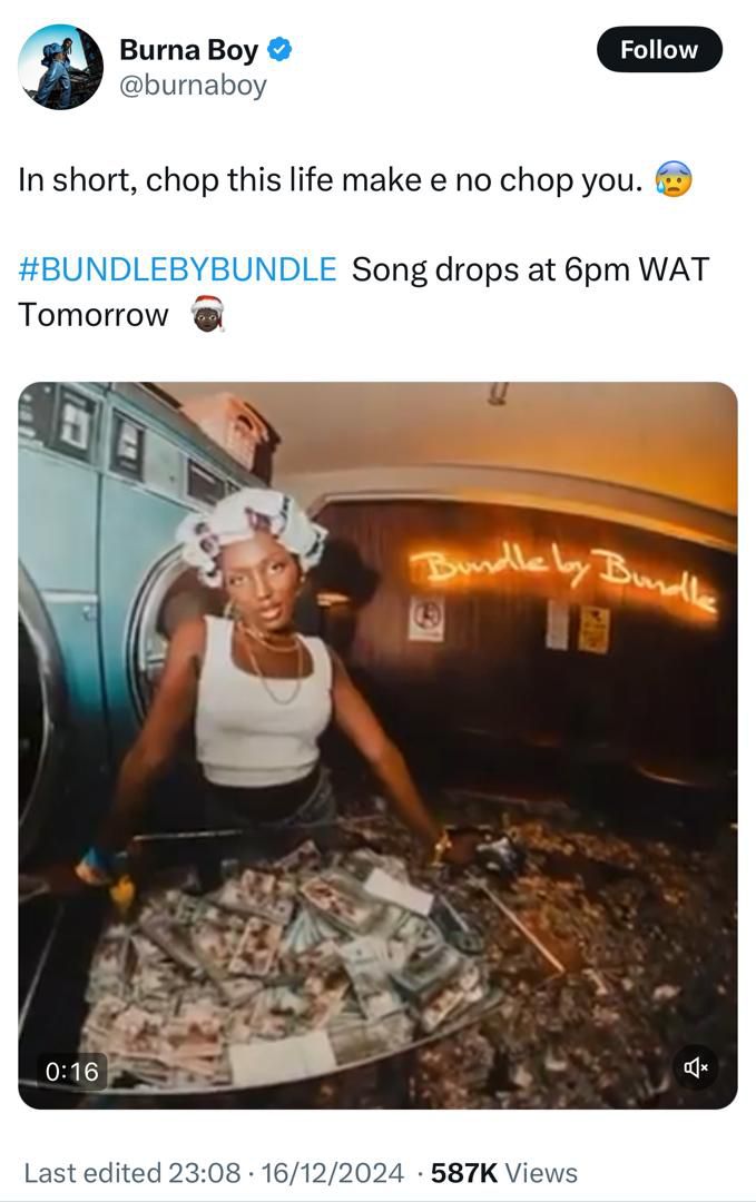In a new update on his X account, Burna Boy will release his new single on Wednesday, 18 December 2024.