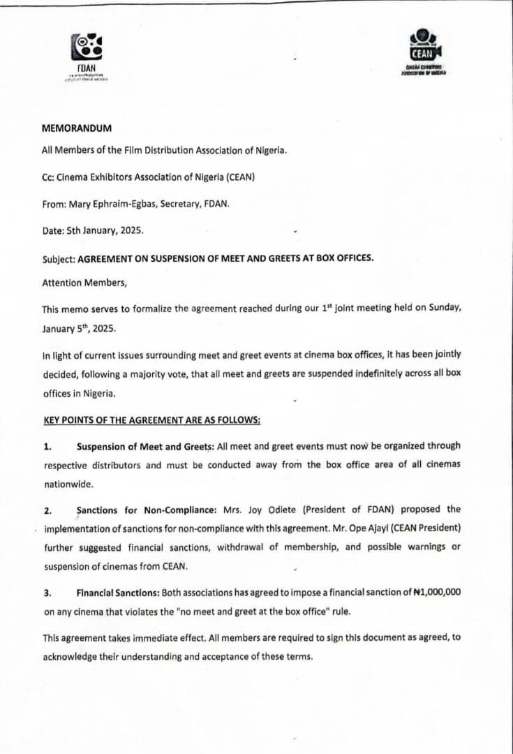 A now-deleted report from ShockNG ignited widespread confusion earlier yesterday, claiming that the Film Distributors Association of Nigeria (FDAN) and the Cinema Exhibitors Association of Nigeria (CEAN) had implemented a nationwide ban on meet-and-greet events.