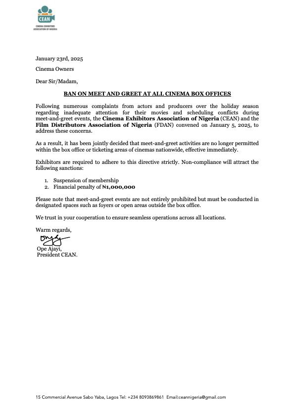 On January 23, 2025, CEAN followed up with a formal letter, signed by President Ajayi, addressing cinema operators nationwide. The letter underscored the importance of the new measures in fostering a seamless and professional cinema experience for fans, filmmakers, and exhibitors alike.
