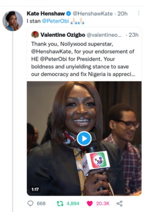 One of Nollywood’s most respected actresses, Kate Henshaw quickly threw her weight behind Peter Obi. From reposting campaign messages to affirming his credibility, she remained publicly Obidient throughout the election season. For Kate, this wasn’t just politics—it was a plea for better governance.