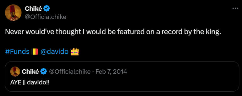 "I never thought I would be featured on a Davido song," Chike says in a post on X.