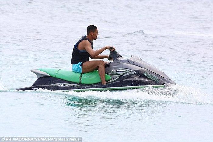 Chris and his partner were seen having fun on a jet ski in an exotic location in Barbados.