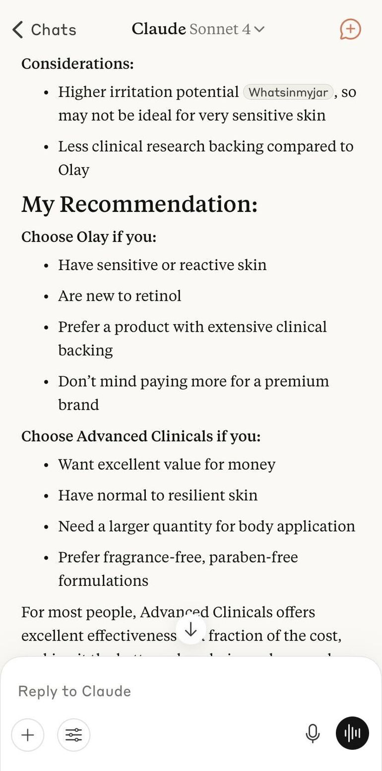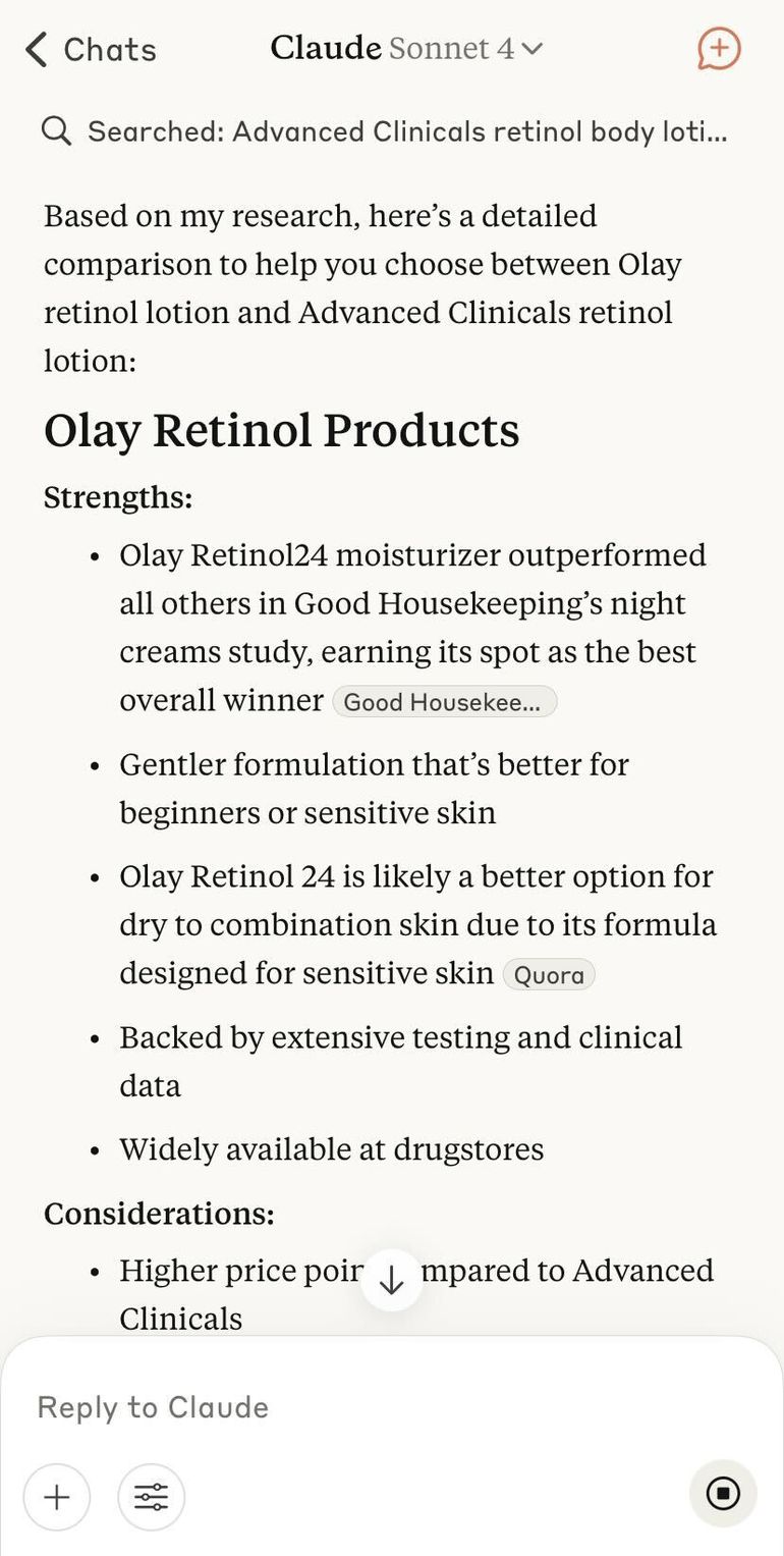 For example, when I asked Claude to compare the Olay Retinol24 Body Lotion and the Advanced Clinicals Retinol Lotion, it broke down online reviews, ingredients, and use cases with clarity. It didn’t just regurgitate the brand’s marketing; rather it told me: