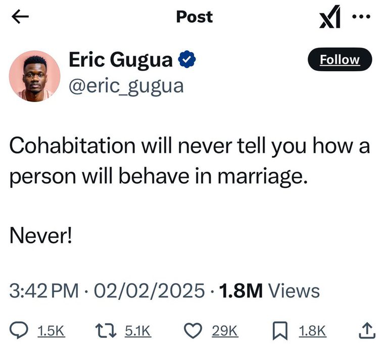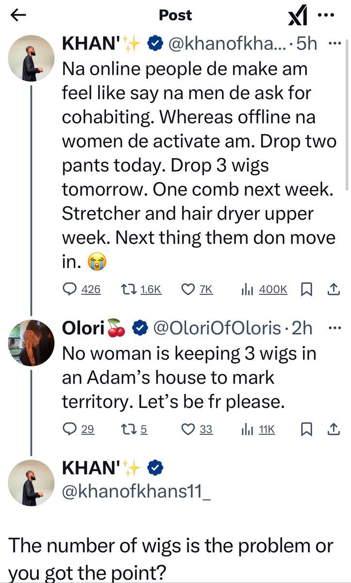 The main point of that tweet was to enforce that cohabitation can't help one truly know one's partner. But the conversation quickly shifted to a debate on who loves/wants cohabitation more.