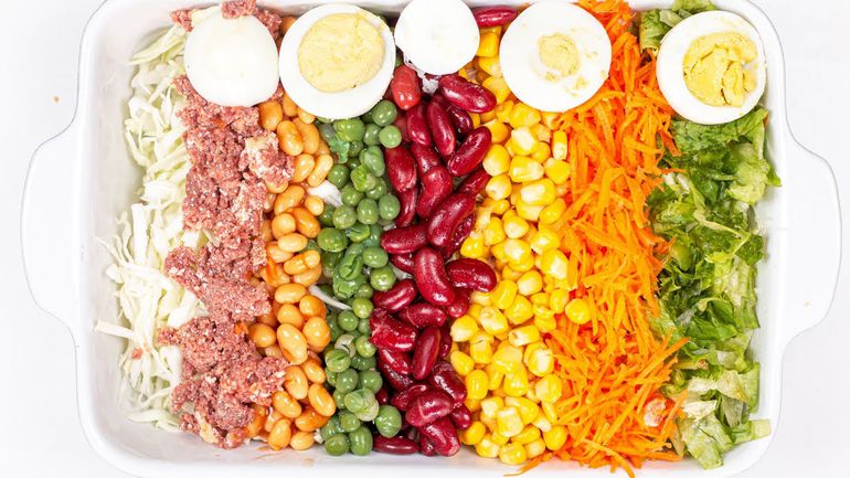 Nigerian salad is a full mix of veggies, sweet corn, boiled eggs, and more mayo than your arteries are probably ready for. This dish can be paired with jollof rice, grilled chicken, or just eaten solo.
