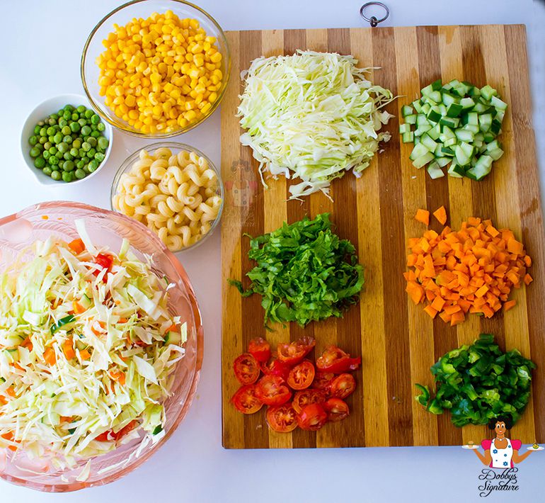 5. Assemble the salad: In a large mixing bowl, combine the shredded cabbage, lettuce, diced tomatoes, cucumber, grated carrots, cooked pasta or boiled potatoes, and sweet corn. Mix everything gently to combine.
