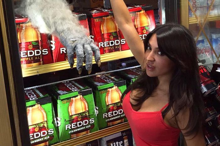 Who will help this beautiful woman fend off the monster to get her sweet refreshment?