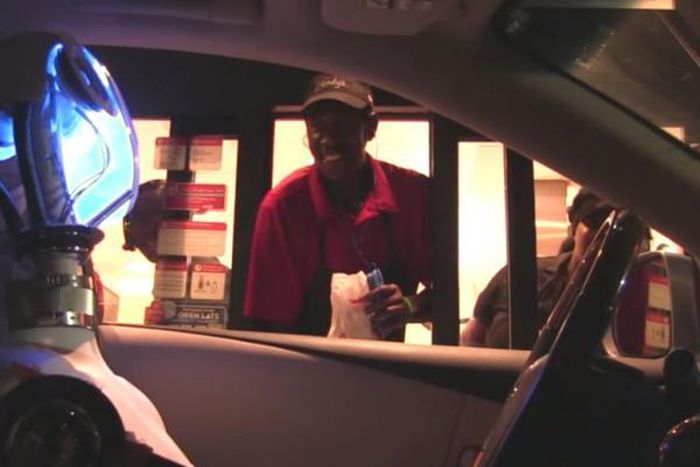Some of the workers appear startled by the robot, some are amused and one drive-through worker simply stares blankly at the robot and flatly states, "This confuses me."