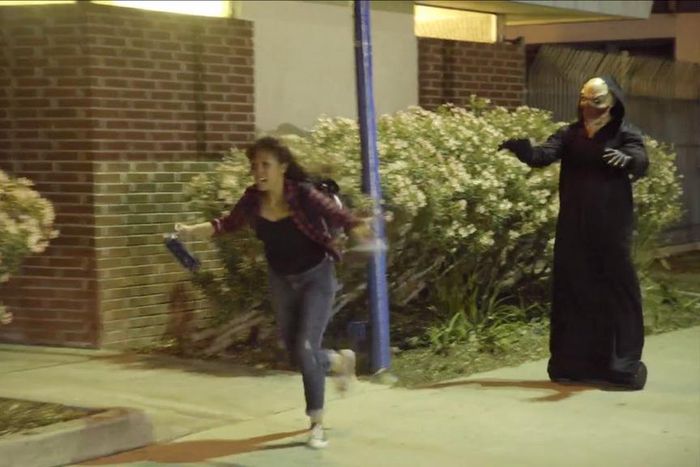 He dressed up in black, put on a scary mask and went into the neighborhood at night, bumping into people and scaring the hell out of them!