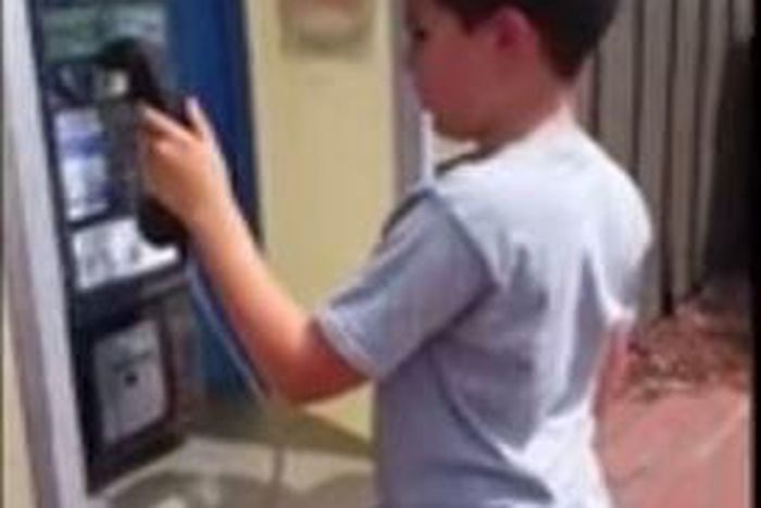 a mother records her son looking strangely at a Payphone. The strange look on his face at he looks at the pay phone really highlights how far technology has gone within the last two decades.