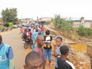 Residents of Ifedolapo Community on Monday morning as they take a look at a lifeless body under the Osere Bridge on Monday. [NAN]