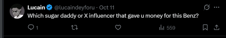 “Women no go buy Lamborghini with their money. Not possible," “Exchange rate of kpekus in Naija is what? $Lambo,” “Only God knows who dis one open legs for”