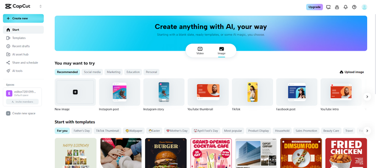 Log in CapCut and then select "Image" from the main menu. Click on "New image".