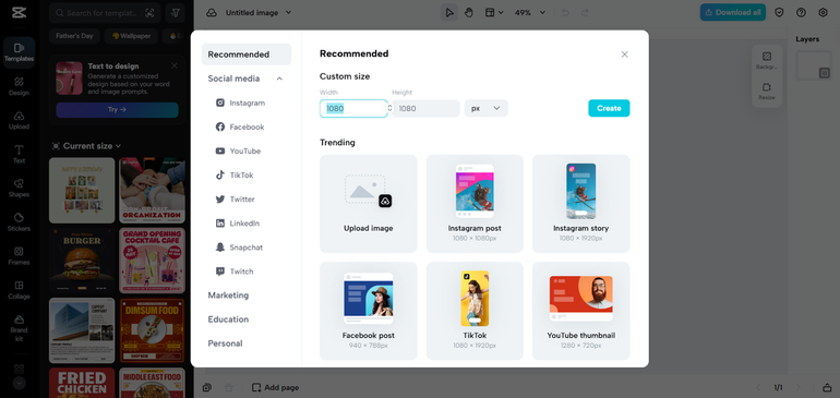 The main editing page will open, showing you a pop-up to set canvas dimensions. You can choose Instagram’s standard presets or set your own. Then upload your preferred photo from device storage, Cloud, Google Drive, or Dropbox. If you don’t have one, pick a pre-designed template to start instantly.