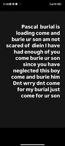 “Pascal burial is loading come and burie ur son am not scared of diein I have had enough of you come burie ur son since you have neglected this boy come and burie him Dnt wrry dnt come for my burial just come for ur son.