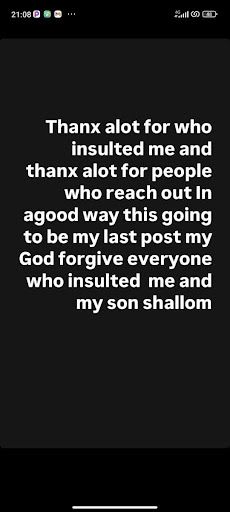 “Thanx alot for who insulted me and thanx alot for people who reach out in agood way this going to be my last post my God forgive everyone who insulted me and my son shalom.”