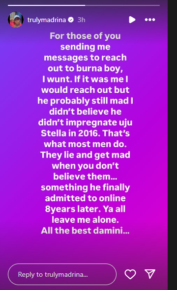The reason, she noted, is that Burna Boy is probably still angry with her for believing Uju Stella who alleged that he impregnated her in 2016.
