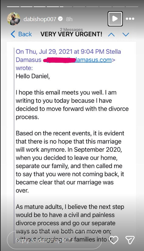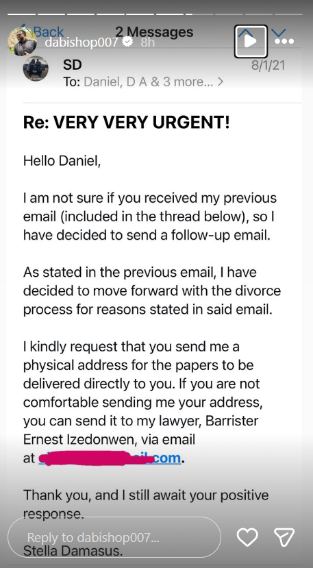 "I would ignore anything, but not lies," he noted, accompanying the post with screenshots of an email Damasus allegedly sent on July 20, 2021, in which she asked for an address to forward divorce documents.